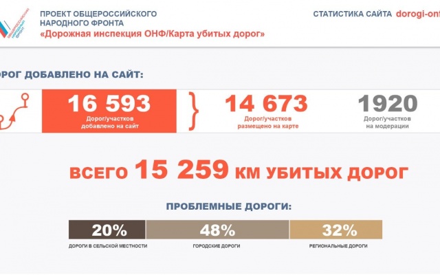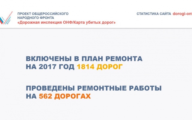 А по итогам работы проекта dorogi-onf.ru за три месяца, было отмечено более 15 тысяч км "убитых" дорог. 1814 дорог, отмеченных на интерактивной карте ОНФ, уже включены в план ремонта на 2017 год, а 562 дороги уже отремонтированы.