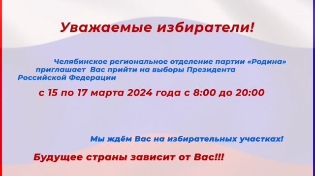 Мы, команда регионального отделения партии "РОДИНА" призываем наших активистов, соратников и неравнодушных жителей России прийти на участки и проголосовать за лучшее будущее. Вместе мы сможем всё - ради наших детей и внуков, ради света, ради Родины!"