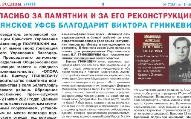 Руководитель ветеранской организации Брянского Управления ФСБ Александр Полуешкин выразил от имени своих товарищей и всего Управления благодарность Председателю регионального отделения Общероссийской организации малого и среднего предпринимательства "ОПОРА РОССИИ" Виктору Гринкевичу за строительство памятника воинам-чекистам в селе Белоголовль Жуковского района. Обращение распространено пресс-службой УФСБ 21 июня 2021 года: "Данный памятник является важным мемориальным сооружением, установленным на месте перехода партизанского отряда под командованием Героя Советского Союза Д.Н. Медведева за линию фронта в годы Великой Отечественной войны. Указанное событие приобретает особое значение в год 80-летия основания партизанского движения на Брянщине. От лица ветеранов органов безопасности выражаем благодарность В.Г. Гринкевичу за помощь в создании памятника и обеспечение его реконструкции".