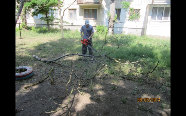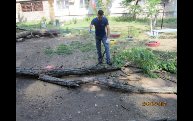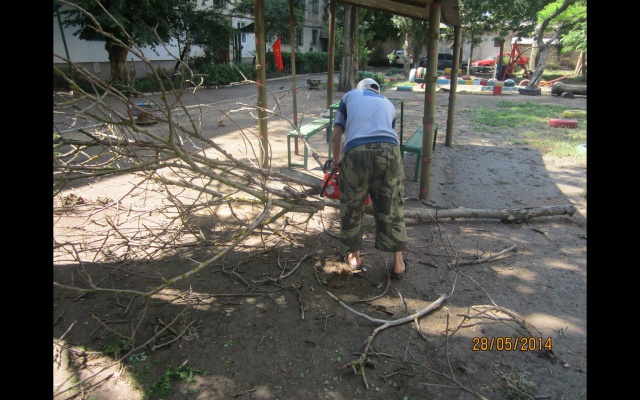 И уже 28 мая, утром, наши активисты: Огороднов Руслан, Карлов Сергей, Григоренко Андрей, Малиборский Сеогей, Гридасов Юрий, Перминов Алексей, во главе с председателем Александром Бакаловым, спилили это и ещё несколько сухих деревьев рядом с детской площадкой.