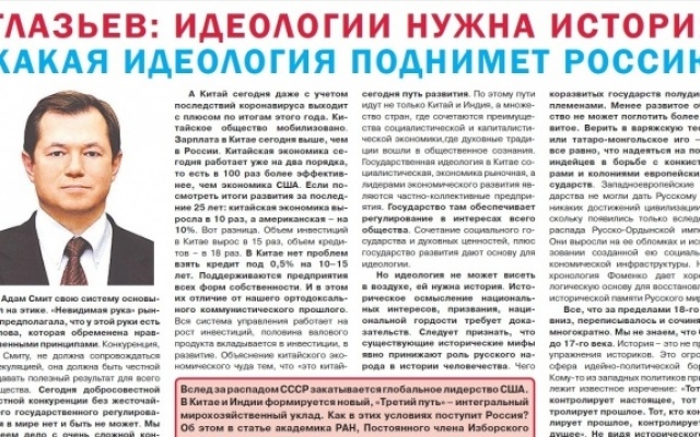 Полностью согласен с экономической концепцией академика РАН Сергея Глазьева и с его позицией о величии России в истории. Его интересуют истина и интересы Родины. Он давно напал на след и идет по нему, он не переставал давить на самые чувствительные места либералов, пока наконец не вскрыл раны, которые можно теперь начать лечить. И как раз раздраженная реакция либералов и отдельных историков служит указанием, что Глазьев публично открыто обнаружил узел всех проблем нашей страны.