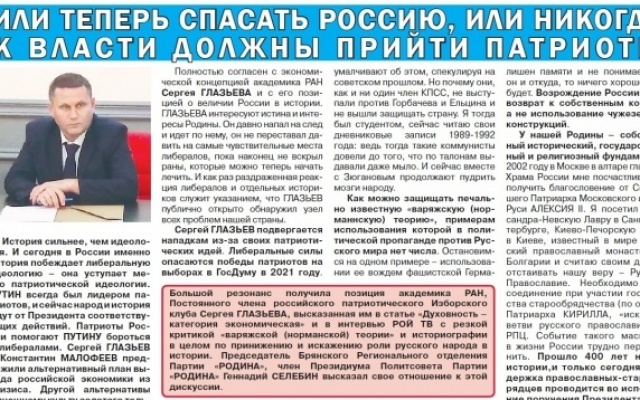 На развороте газеты публикуются статьи постоянных членов российского патриотического Изборского клуба академика РАН Сергея Глазьева и лидера патриотов Брянщины Виктора Гринкевича.