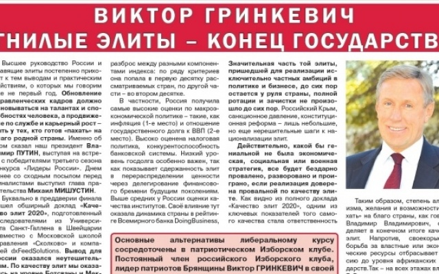 Основные альтернативы либеральному курсу сосредоточены в патриотическом Изборском клубе. Постоянный член российского Изборского клуба, лидер патриотов Брянщины Виктор Гринкевич в своей новой статье "Гнилые элиты - конец государства" отмечает, что "качество элиты определяет качество всего: экономики, политики, конкурентоспособности, образования, технологий, спорта, ЖКХ…" Виктор Григорьевич - один из немногих политиков и экспертов, чья позиция совпадает с принимаемыми государственными решениями.