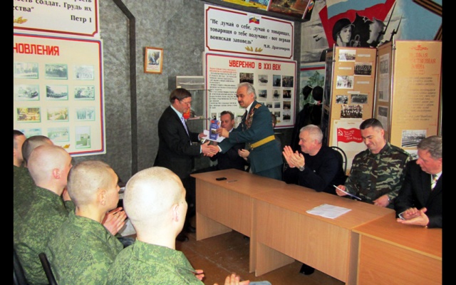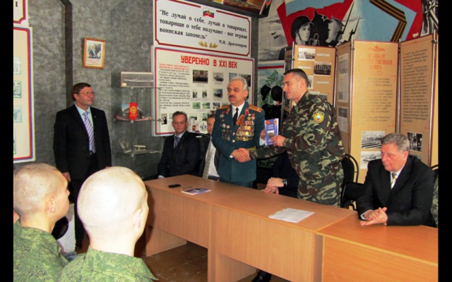 В заключение своего выступления, пожелав призывникам удачи, Федор Юрин вручил представителю Президентского полка подполковнику Алексею Шатскому в подарок для музея боевой славы части сборник стихов о Родине "Память сердца".