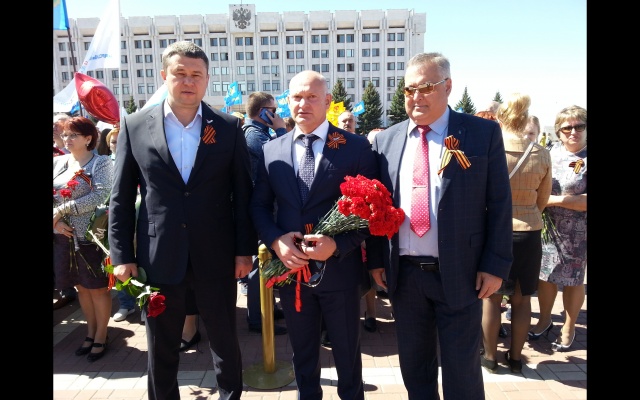 Представители Самарского регионального отделения партии "РОДИНА" прошли по площади Славы в одной колонне с лидерами и активистами регионального отделения Общероссийского народного фронта в Самарской области, и вместе возложили цветы к Вечному огню.