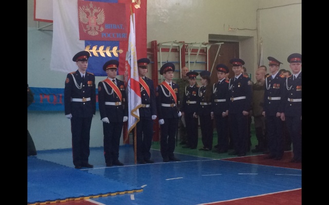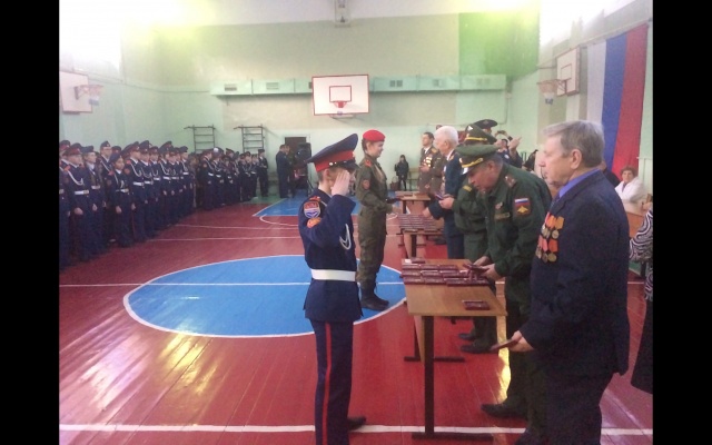 Традиционно в спортивном зале школы собрались учащиеся кадетских классов, родители и почетные гости, среди которых были представители администрации Советского района, ветераны Великой Отечественной войны и боевых действий.