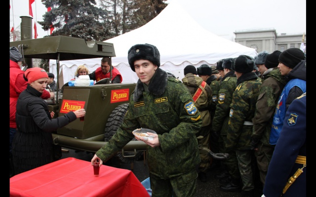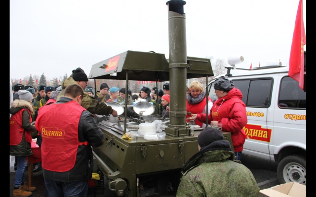 Патриоты Самарского регионального отделения партии развернули на площади большой парадный шатер, в котором угощали ветеранов и многочисленных гостей праздника обедом, приготовленным на полевой кухне "РОДИНЫ".